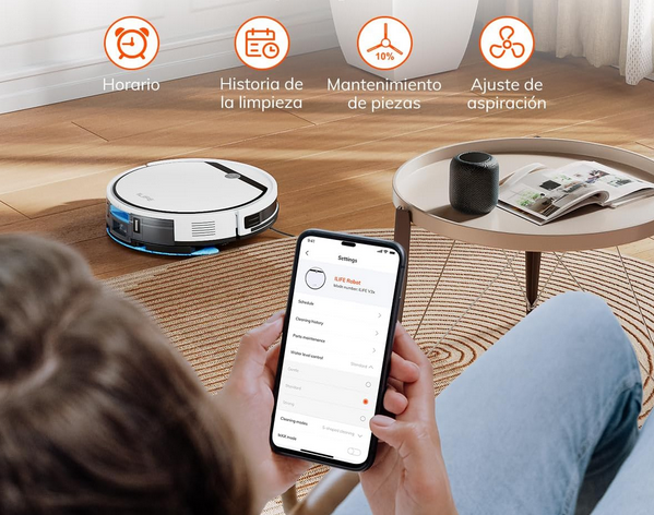 - Navegación Inteligente: Sensores anti-caída y anti-colisión evitan escaleras y muebles; mapeo básico para habitaciones simples.
